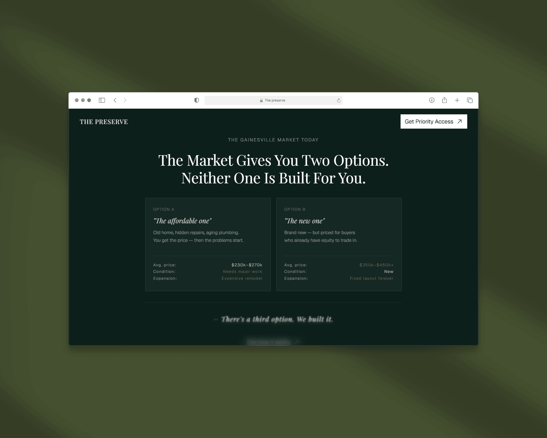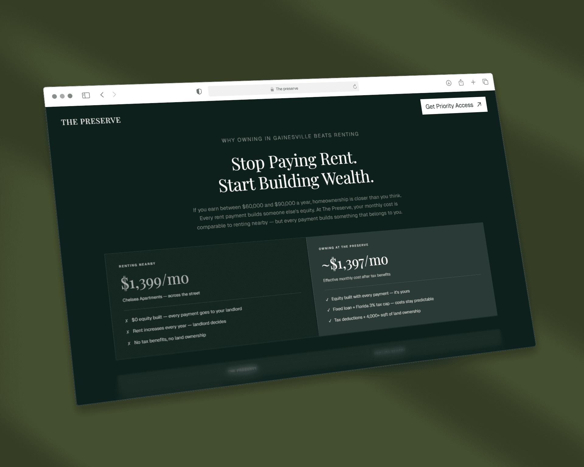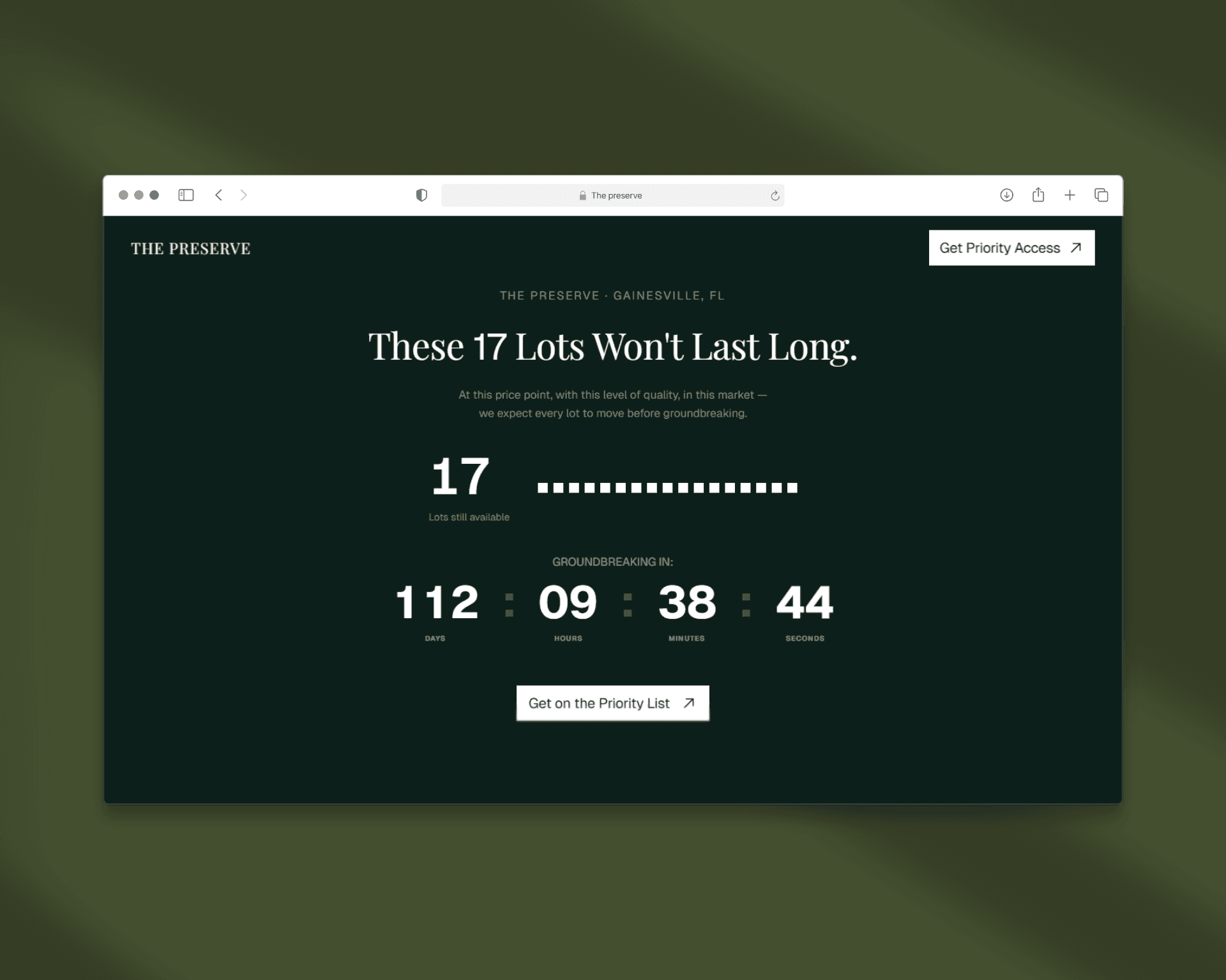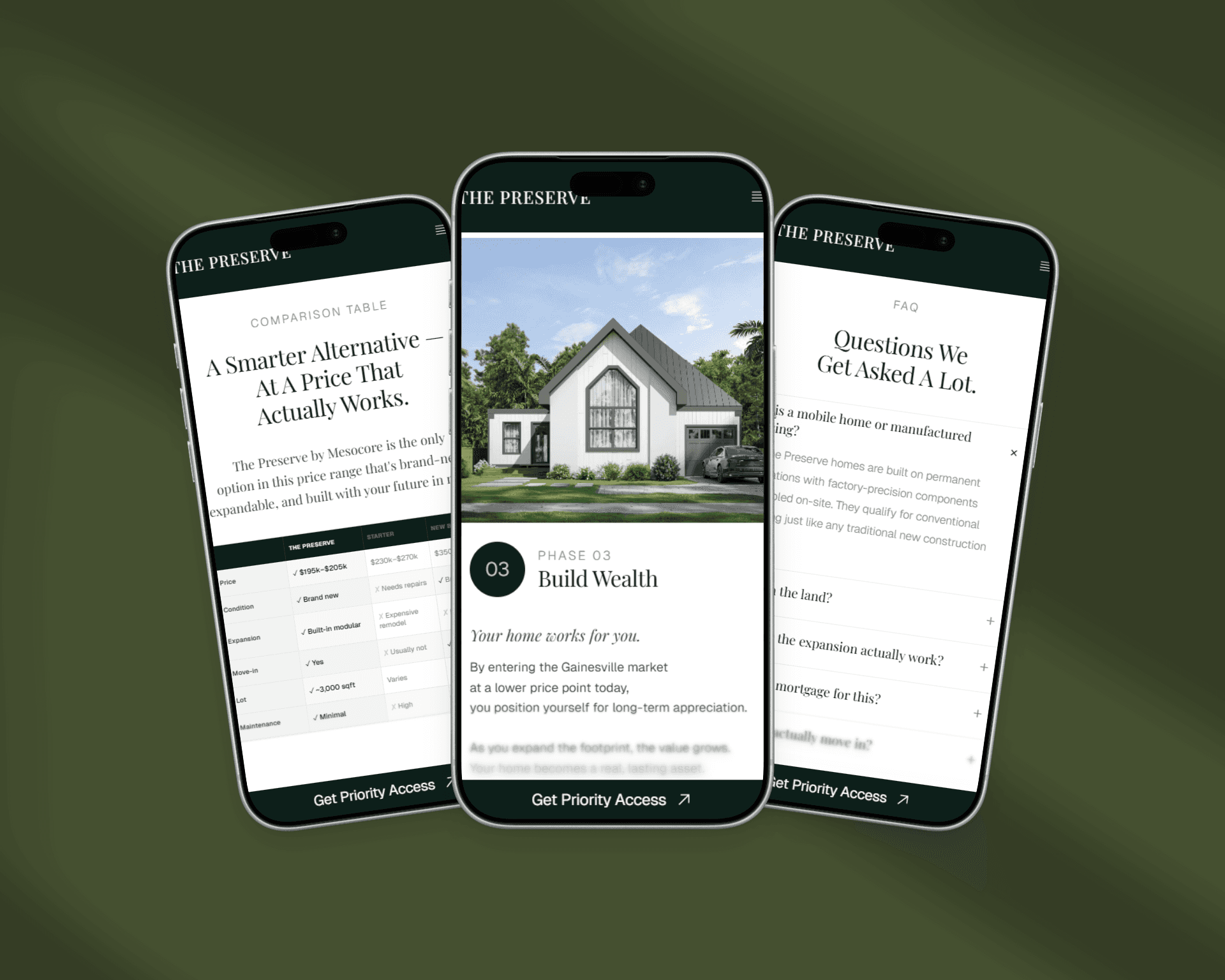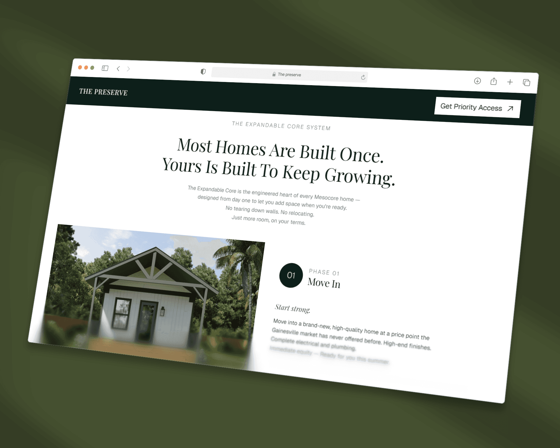 Mesocore Modular Homes engaged me to design and develop the full landing page for The Preserve, their first residential development aimed at first-time homebuyers in the Gainesville, FL market. The page needed to communicate a new concept — expandable modular construction — to an audience unfamiliar with the product category, while driving signups to a priority interest list ahead of groundbreaking. The final deliverable included a fully responsive Framer build (desktop, tablet, and mobile), a live interactive lot map, HubSpot form integration with a custom Thank You redirect, a countdown timer, YouTube and Google Maps embeds, and an end-to-end CRO strategy informing every copy and layout decision.