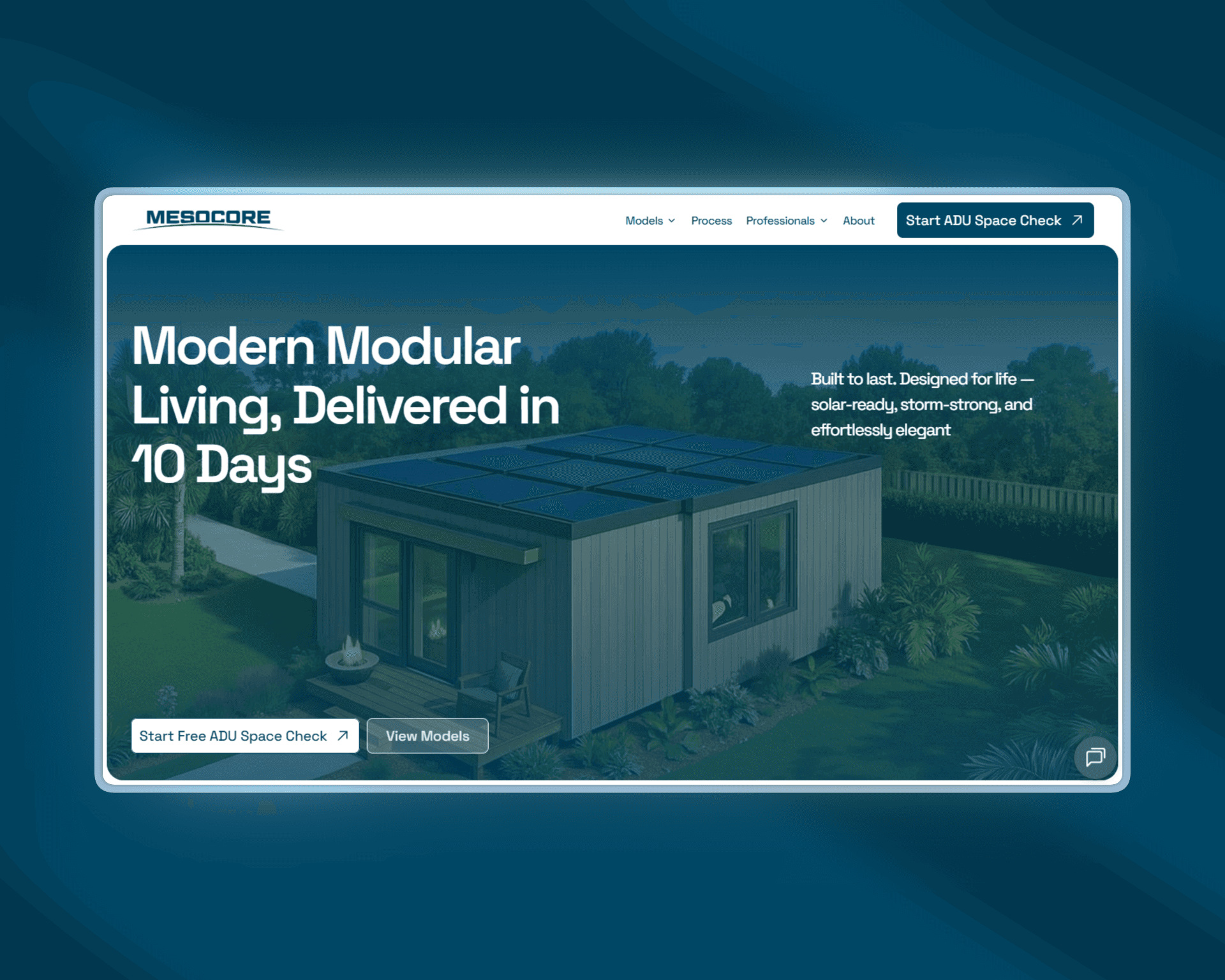 The Gainesville market offered first-time buyers a binary choice: aging homes with hidden repair costs, or new construction priced well out of reach. Mesocore's Expandable Core system was the solution — but it was an entirely new concept that required education before persuasion. The challenge was to position a $195,000 modular home not as a compromise, but as the smarter, more strategic entry into homeownership. Additionally, the page needed to qualify leads from the first scroll to ensure only genuinely interested buyers completed the form.
